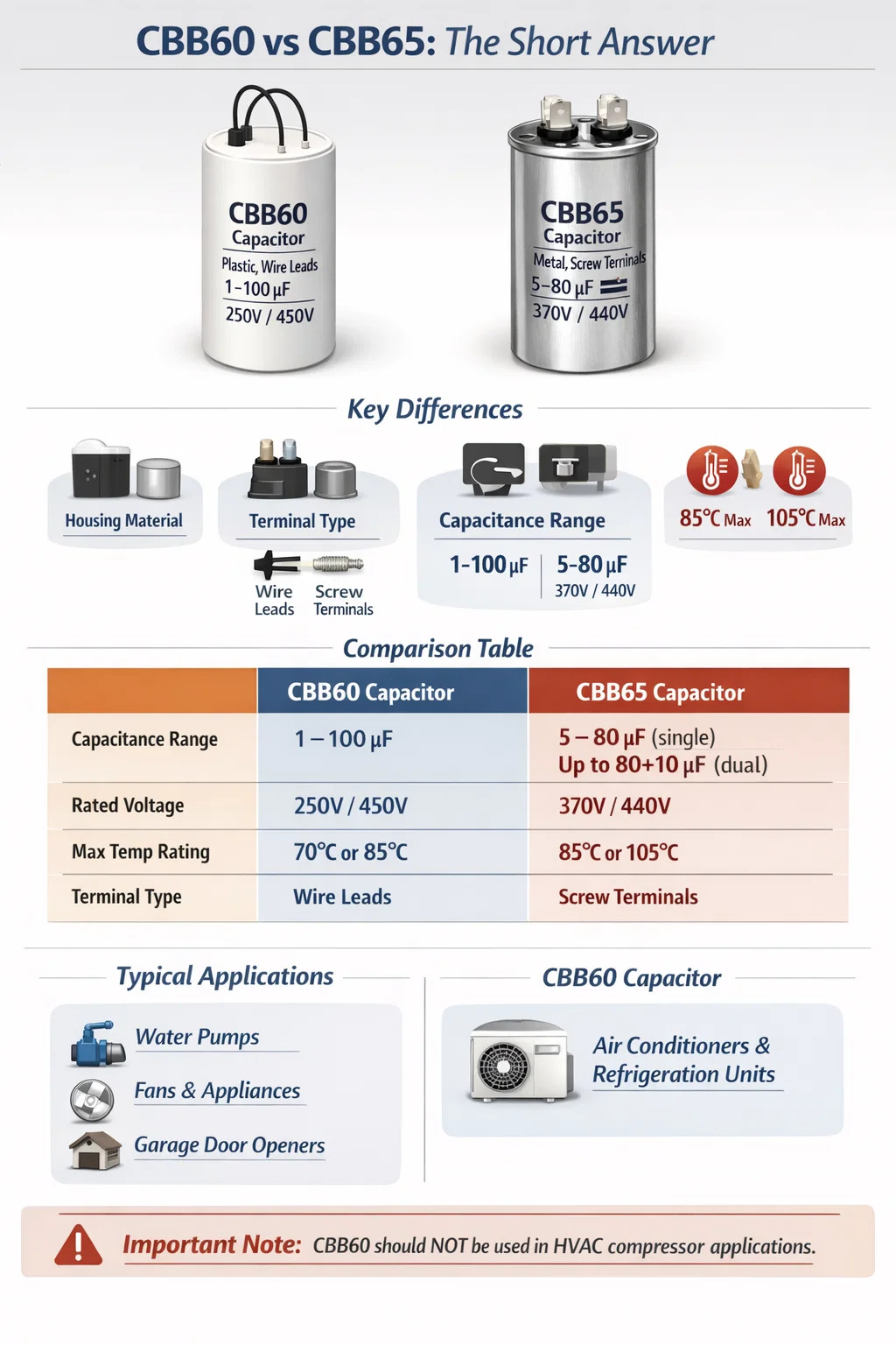 Kısacası: CBB65 çoğu uygulamada CBB60'ın yerini alabilir ancak CBB60, kompresör uygulamalarında CBB65'in yerini almamalıdır.