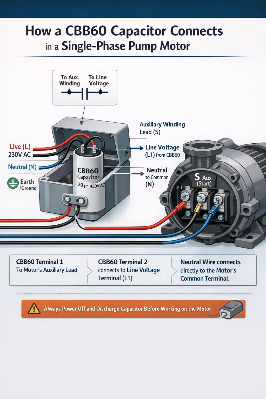 En yaygın senaryoda (harici kapasitör kutulu tek fazlı bir pompa motoru) gelen canlı kablo ve motorun yardımcı kablosunun her ikisi de CBB60'a bağlanır, nötr ise doğrudan motorun ortak terminaline bağlanır. Motor, kapasitörden geçen akımın besleme voltajını kabaca 90 derece ilerletmesi nedeniyle çalışır ve tek fazlı bir kaynağın tek başına oluşturamayacağı dönen manyetik alan üretir.