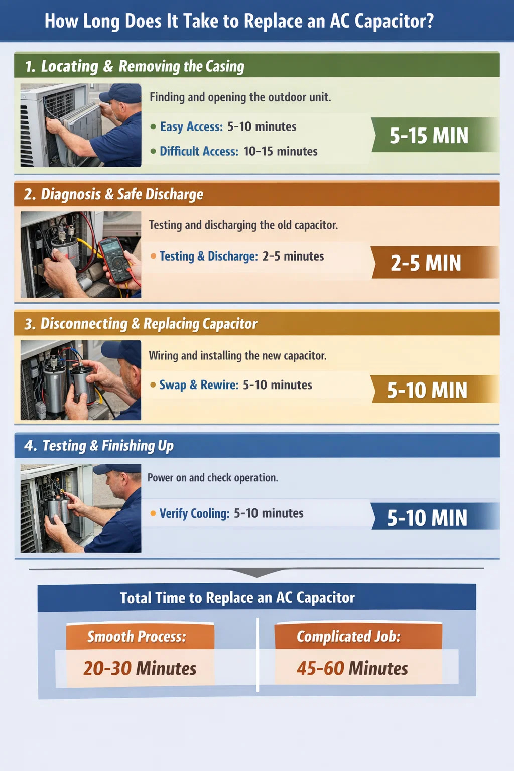 Bir parçanın değiştirilmesi gerçekte ne kadar sürer? AC kapasitör ? Teknisyenin yalnızca birkaç dakikasını izlerseniz işin şaşırtıcı derecede hızlı olduğunu düşünebilirsiniz. Ancak teknisyenin geldiği andan klimanın tekrar soğuk hava üflemeye başlamasına kadar tam bir süreç söz konusudur.