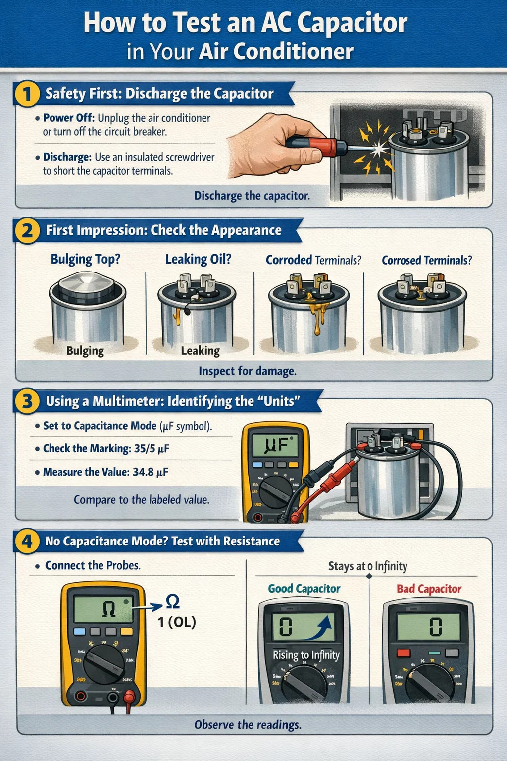 Bir klimadaki AC kapasitörünün iyi mi yoksa kötü mü olduğunu belirlemek, profesyonel elektronik mühendisliği bilgisi gerektirmez. "Kapasitans testi" fonksiyonuna sahip bir multimetreniz olduğu sürece bu adımları takip edebilir ve kendiniz yarı uzman olabilirsiniz.