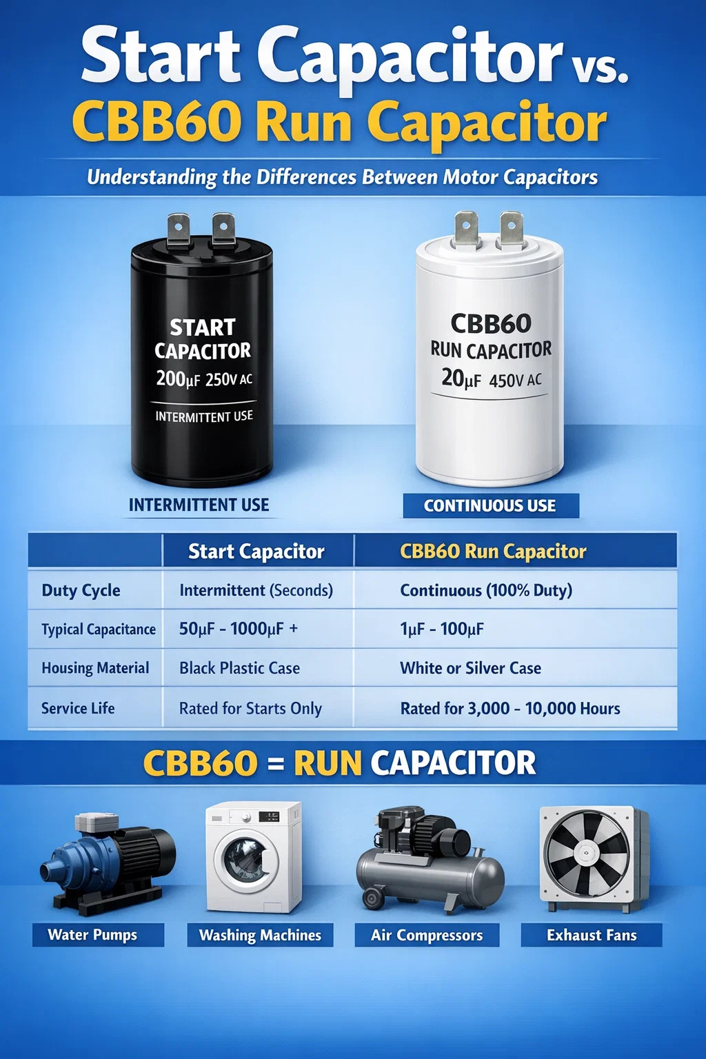 Fonksiyonel Farklılıklar: Başlatma Kapasitör ve CBB60 Çalıştırma Kapasitör
