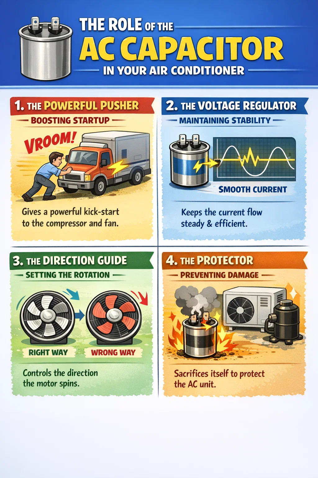 AC kapasitör (klima kondansatörü), klimanızdaki "yedek pil" veya "güçlendirici" gibidir. Her ne kadar küçük olsa da (genellikle küçük bir gümüş metal kutu), klimanız onsuz çalışamaz.