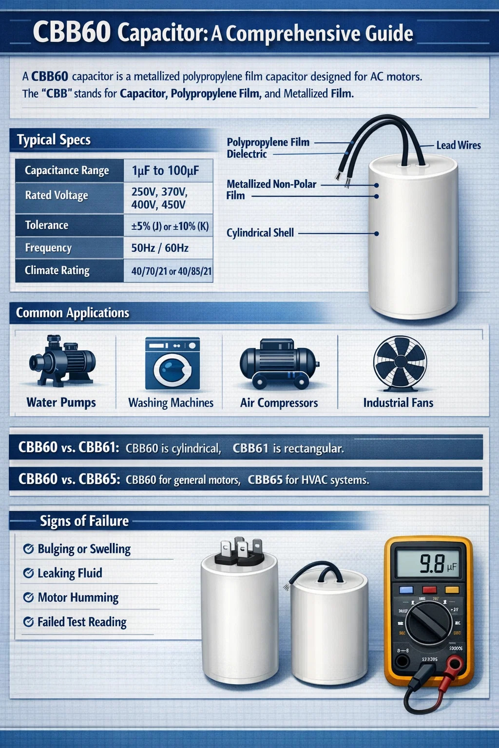 bir CBB60 kapasitör öncelikle AC motor uygulamaları için tasarlanmış özel bir metalize polipropilen film kapasitör türüdür. "CBB" tanımı, malzeme bileşimini ifade eder: "C" kapasitör için, "B" polipropilen film dielektrik için ve ikinci "B" polar olmayan metalize film için kullanılır. Bu kapasitörler resmi olarak çalıştırma kapasitörleri olarak sınıflandırılır; yani motor çalışırken torku korumak ve verimliliği artırmak için devrede kalırlar.