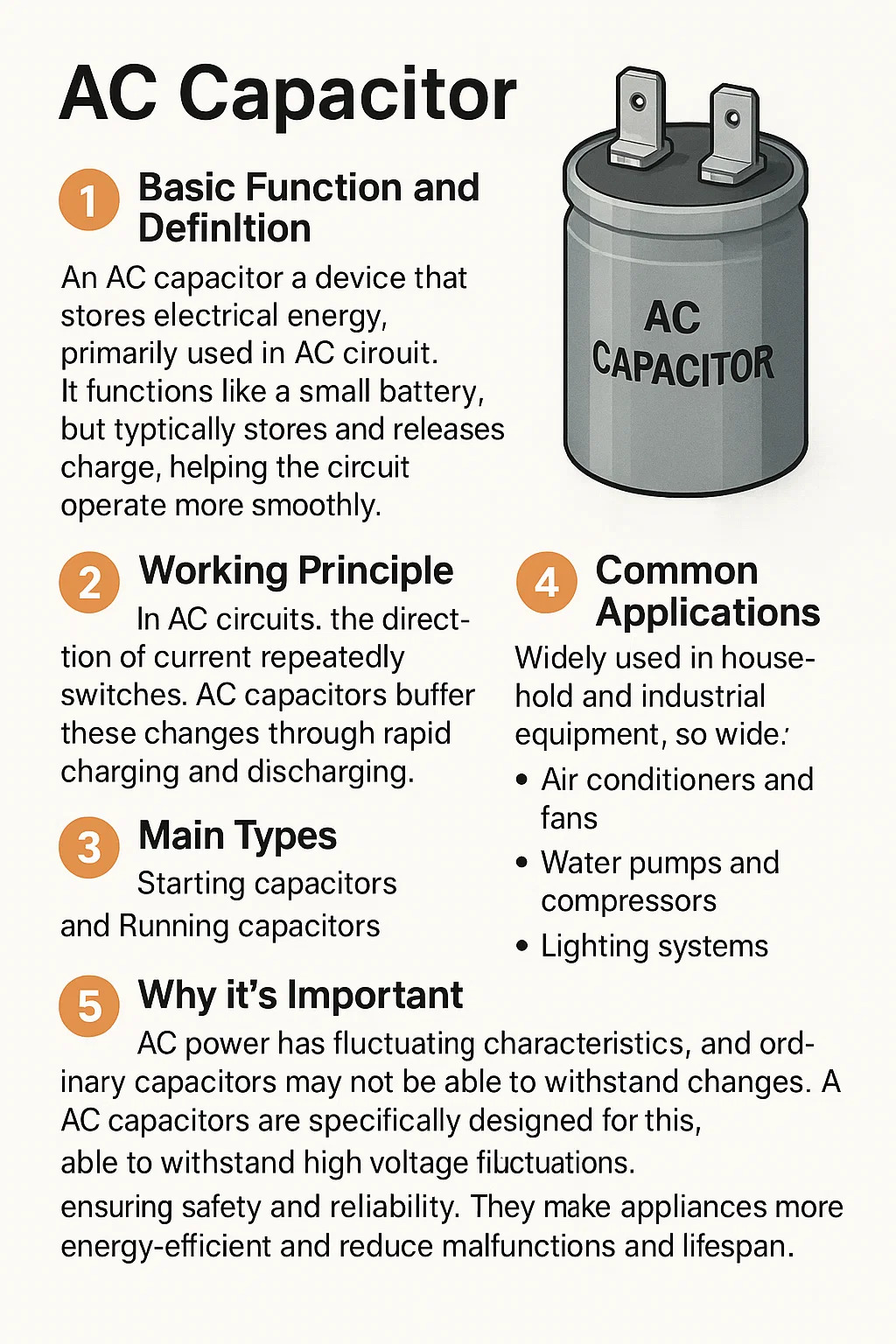AC kapasitör, öncelikle AC devrelerinde kullanılan, elektrik enerjisini depolayan bir cihazdır. Küçük bir pil gibi çalışır ancak farklı çalışır; elektrik üretmez; bunun yerine, şarjı geçici olarak depolayıp serbest bırakarak devrenin daha düzgün çalışmasına yardımcı olur. DC cihazlarda sıradan kapasitörler kullanılabilirken, AC kapasitörler, AC akımının yönü ve büyüklüğü sürekli değiştiğinden, AC gücünün özelliklerine göre özel olarak tasarlanmıştır.
